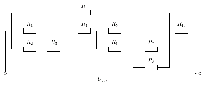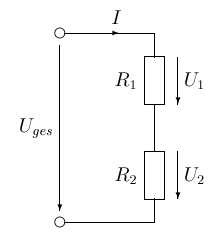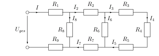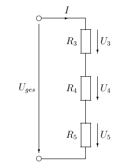 Bestimmen Sie den Gesamtwiderstand, den Gesamtstrom und die dargestellten Teilspannungen! (Uges = 15 V)