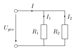 In einer Parallelschaltung von zwei Widerständen wurden bei einem Gesamtstrom von 30 mA an dem ersten Widerstand eine Spannung von 10 V und ein Strom von 12,2 mA gemessen. Berechnen Sie R1, R2 und I2!