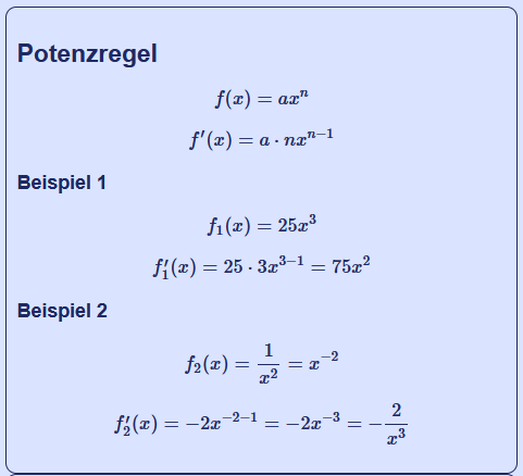 - Ableitungsregeln- Potenz-, Produkt-, Quotienten- und Kettenregel werden an Beispielen dargestellt
