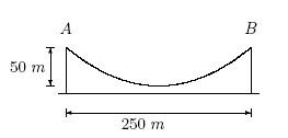 Zur Planung von Hochspannungsmasten gehört die Bestimmung der auf die Masten wirksamen Kräfte. Die Drahtseile dieser Hochspannungsleitung sind bei den Punkten A und B an den Masten befestigt. Sie bilden die Form einer Parabel. Der tiefste Punkt der Parabel liegt 50 m unterhalb der beiden Aufhängungspunkte. Quelle: Mathematik zur Fachhochschulreife, Cornelson Verlag, S.257 |