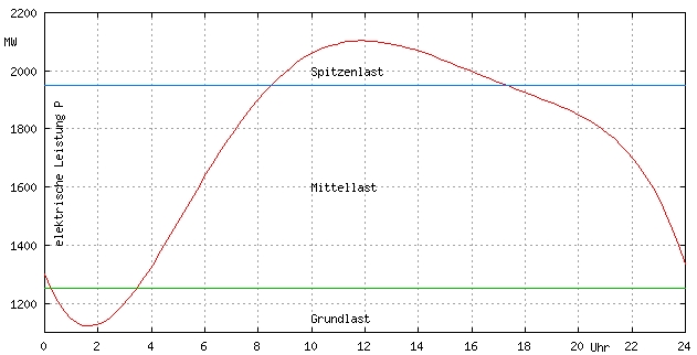 In der folgenden Grafik ist die Tagesbelastung an einem Sommertag eines Energieversorgers dargestellt. Die Grundlast wird von Kraftwerken erzeugt, die rund um die Uhr arbeiten. Zur Deckung der Mittellast werden zusätzliche Kraftwerke eingesetzt, die eine längere Anlaufzeit benötigen. Zur Deckung der Spitzenlast werden Kraftwerke verwendet, die innerhalb weniger Minuten die volle Leistung erbringen.